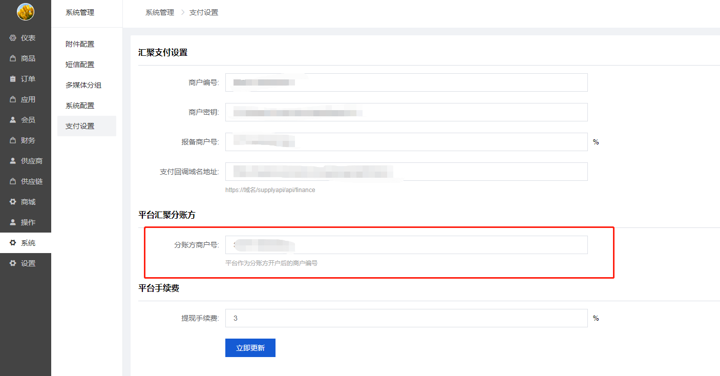 3)平台手续费是给各个供应商分账时所扣除的额外手续费,百分比单位