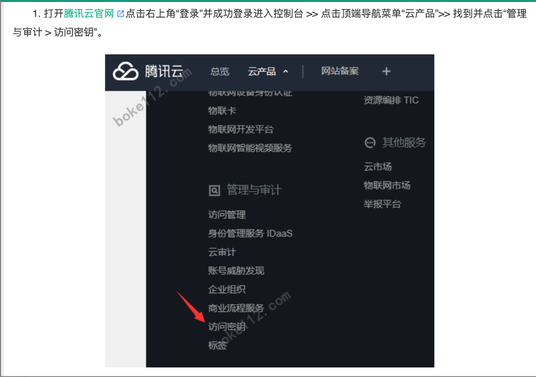 2)腾讯云后台--点击左上角云产品--滑到最后管理与审计版块--点击“访问密钥”