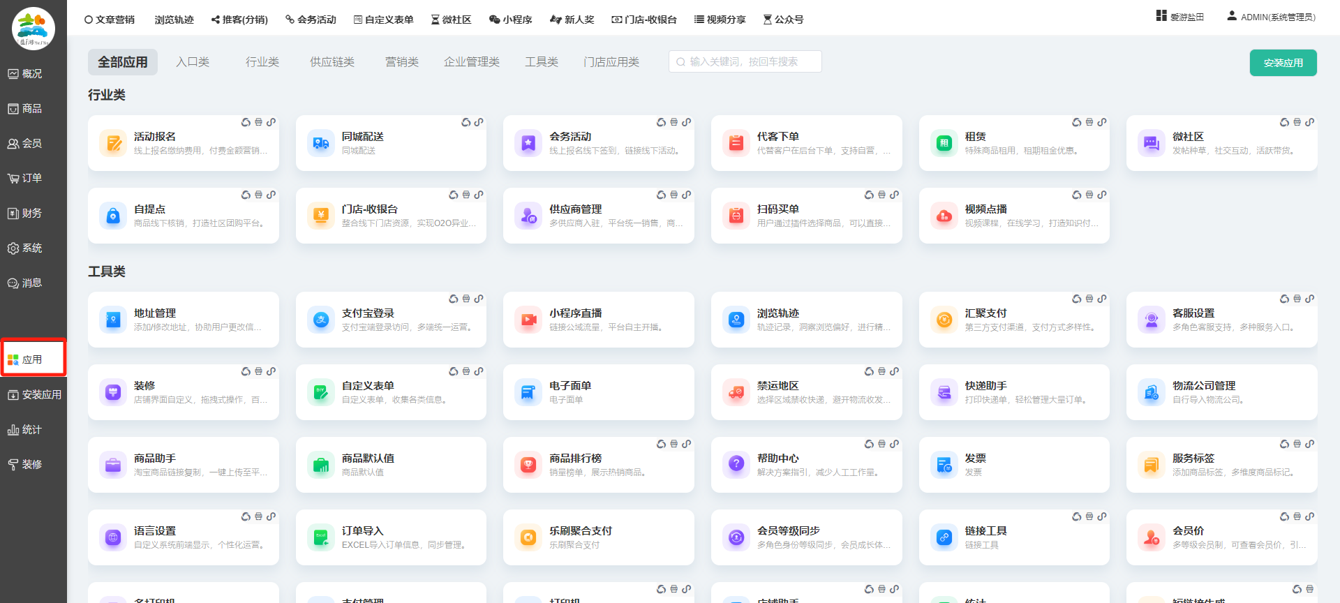 目录 搜索 展开 一、前期准备资料二、数字乡村码-上线操作指南1、服务号的申请流程及认证2、申请小程序流程3、开放平台绑定小程序和公众号三、数字乡村码-系统操作数字乡村码系统管理-概况数字乡村码-商品管理1、发布商品2、商品列表3、商品表单4、商品分类5、品牌管理6、配送模板7、评论管理8、优惠券管理9、商品标签10、退货地址设置11、满额优惠12、批量操作13、配送方式14、基础设置15、商品隐藏四、数字乡村码-会员管理1、全部会员2、会员等级3、会员分组4、资格申请5、会员设置6、推广中心设置7、会员邀请码8、会员关系链修改关系链修改记录9、会员合并记录10、账号注销管理11、会员设置中心五、数字乡村码-订单管理1、订单管理列表2、订单处理流程3、订单状态4、订单修改价格5、订单退款退货6、多包裹发货7、批量发货订单操作步骤8、催发货订单9、物流查询六、数字乡村码-财务管理1、余额设置2、会员余额3、充值记录4、转让记录5、余额明细6、收入明细7、提现设置8、提现统计9、积分管理10、转账审核11、收益广告12、批量充值七、数字乡村码-系统管理1、商城入口2、商城设置①、商城设置②、订单设置③、物流查询④、短信⑤、联系方式⑥、分类⑦、优惠券⑧、分享⑨、幻灯片⑩、广告位⑫、地图设置3、交易设置4、微信模板消息自定义消息模板(新版)自定义消息模板(旧版)小程序消息模板公众号模板消息变更公告5、语言设置6、权限管理7、多媒体管理八、数字乡村码-消息管理九、数字乡村码-应用管理十、数字乡村码系统-数据统计十一、数字乡村码-页面装修DIY1、模板管理2、店铺页面3、顶部导航4、底部导航5、DIY模板市场6、首屏广告7、基础设置8、装修DIY尺寸建议十二、供应商功能插件操作指南1、供应商2、门店-收银台门店申请和使用步骤门店管理①、门店-收银台 营销设置②、门店-收银台 分润设置门店分类门店申请门店审核门店商品门店商品订单收银台订单数据统计核销员基础设置默认设置门店装修3、微社区4、会务活动十三、营销插件操作指南活动报名提货卡新人奖微店问卷调查积分视频分享1、视频分享基础设置2、视频分享发现管理3、视频分享分类管理4、视频分享评论管理5、视频分享分红记录6、视频分享短视频中心每日红包幸运大抽奖签到优惠券二维码任务奖励优惠劵文章音频文章付费文章限时购新海报拓客卡操作流程积分活动素材中心视频红包十四、入驻门店应用类1、门店预约2、附近商品3、门店定位设置4、门店控制5、门店满额包邮6、门店满额减7、导入商品8、门店搜索9、门店股东10、核销券11、多门店核销1、商城后台设置2、前端功能演示十五、常见问题1、后台登录密码修改流程2、会员-余额,积分,后台如何进行充值与扣除3、如何修改上下级关系4、一种万能的获取商城小程序路径的方法 暂无相关搜索结果! 阅读次数:1484 本文档使用 模王系统 发布 九、数字乡村码-应用管理 九、商城管理-应用显示所有商城已安装并启用的应用,包含以下大类:具体根据自家商城后台系统显示为准。每个应用功能设置步骤较多,请查看相对应应用的学习文档。文档更新时间: 2024-01-08 10:36 作者:链上旅行
