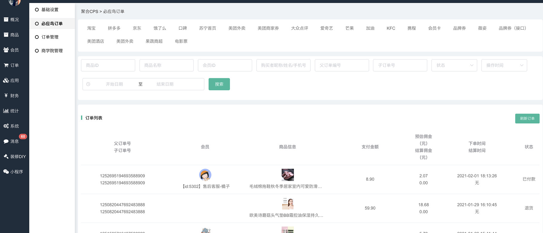 同步聚合CPS接口平台产生的所有订单信息。