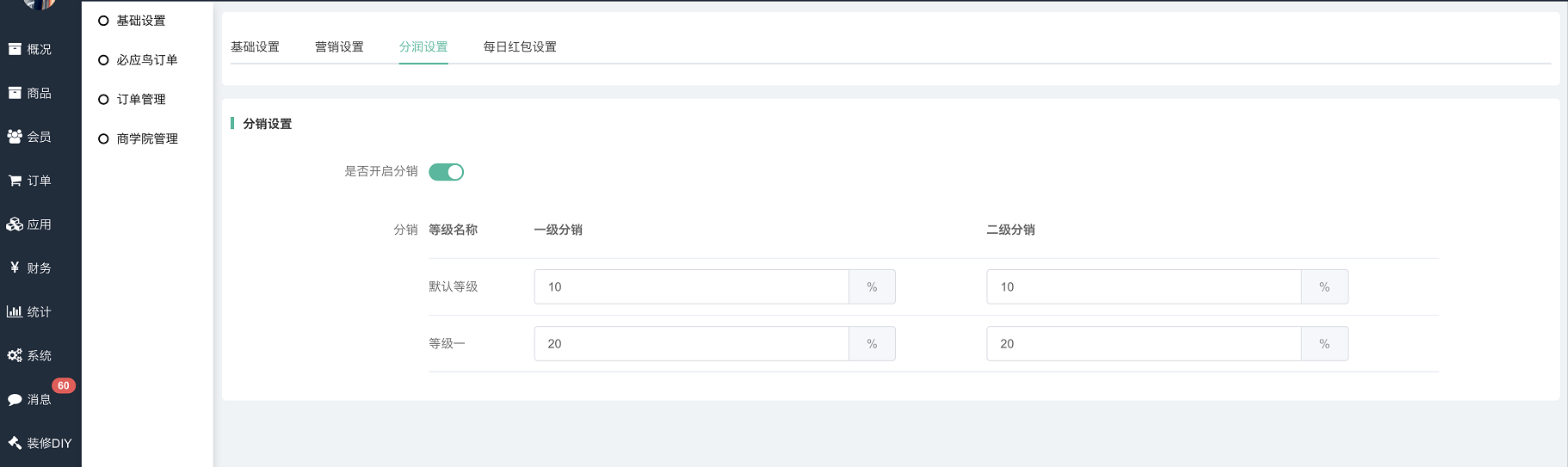 支持按不同分销商等级设置不同的二级分销比例;