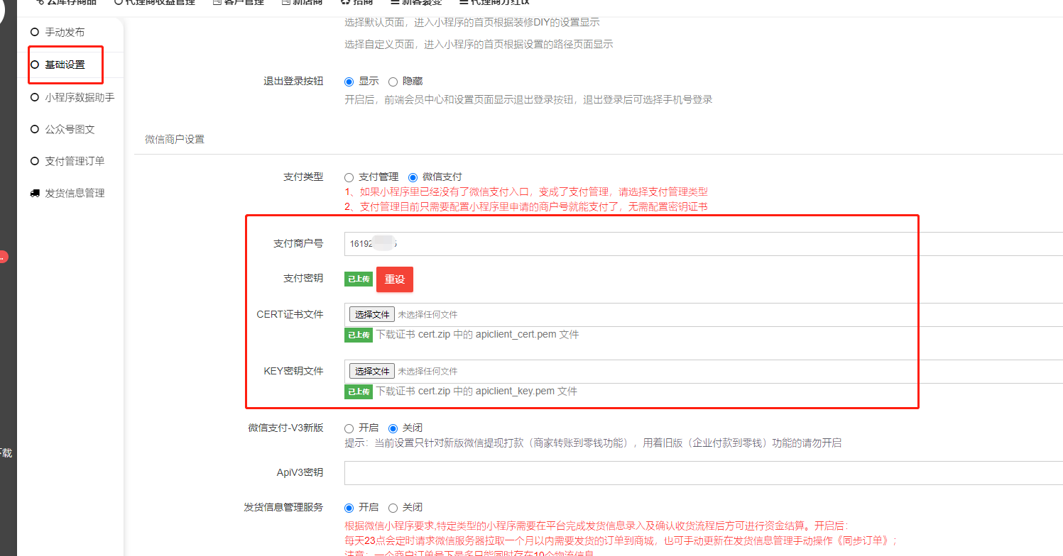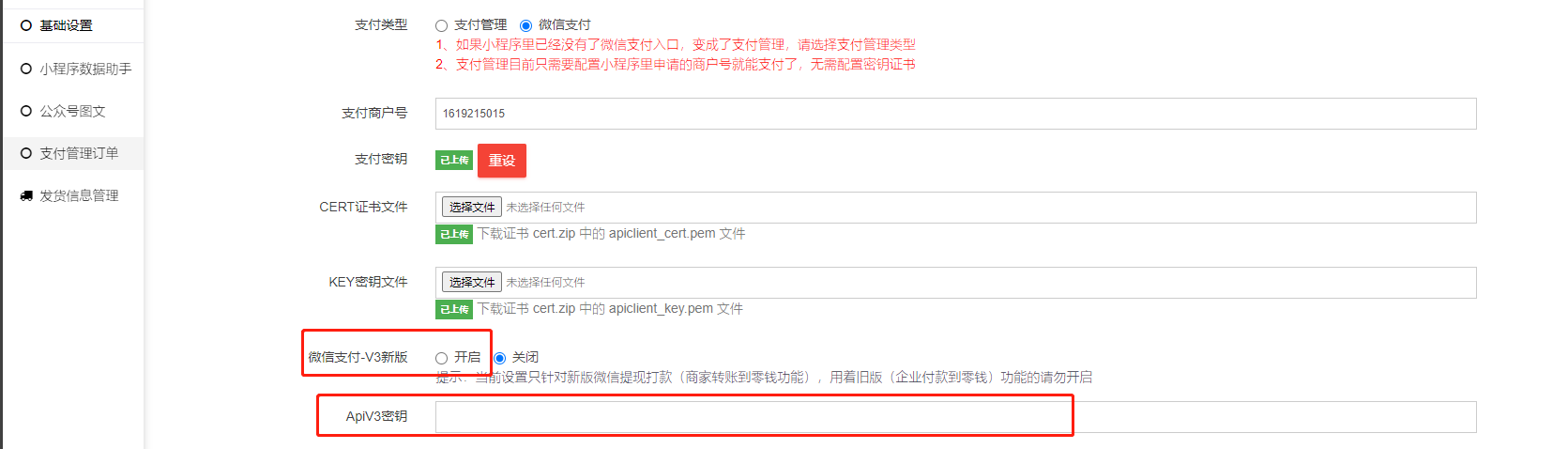 填写小程序微信支付信息,上传微信支付证书(涉及微信支付订单退款方面,注意上传好微信支付证书)