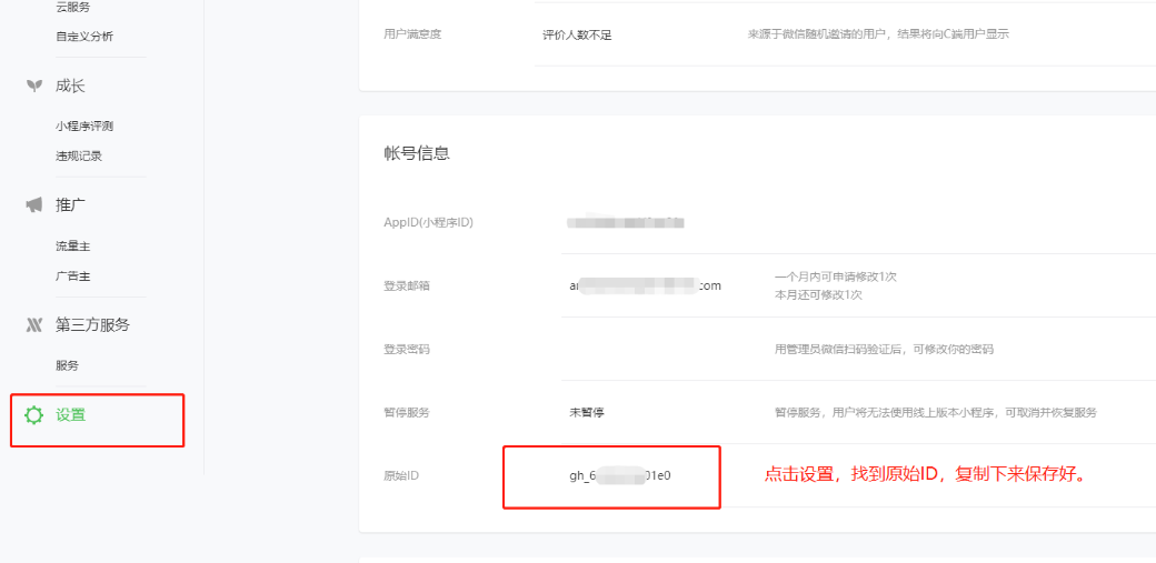 获取小程序原始id的路径:在小程序平台 ==> 设置 ==> 基本设置 ==> 账号信息,查看复制原始id